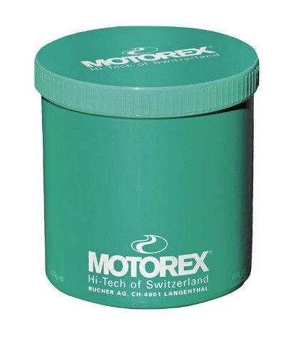 Een pot wit smeervet geschikt voor de ketting. Ten opzichte van de gebruiksvriendelijke kettingsprays kan met de Motorex White Grease op de conventionele manier worden gesmeerd.